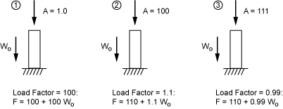 Note that the load factors represent scaling factors for all loads. If certain loads are constant (self-weight gravity loads) while other loads are variable (externally applied loads), you need to take special steps to ensure accurate results. For example, you can iterate on the Eigenvalue buckling solution, adjusting the variable loads until the load factor becomes 1.0 (or nearly 1.0, within some convergence tolerance). Consider the example below: a pole has a self-weight W0 that supports an externally-applied load, A. To determine the limiting value of A in an Eigenvalue Buckling analysis, you could solve repetitively, using different values for A, until you find a load factor acceptably close to 1.0.