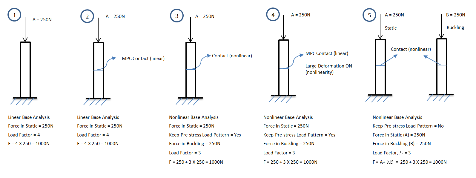 Note: As illustrated, cases (3) and (5) are identical as the base analysis is nonlinear because of nonlinear contact definition. In Case (3), setting the Keep Pre-Stress Load-Pattern property to automatically retains the loading from the pre-stress analysis. As a result, there is no need to define new loads for the buckling analysis in Case 3. For Case 5, the Keep Pre-Stress Load-Pattern property is set to , enabling you to define a new load pattern in the buckling analysis that can be completely different from that of the Static Structural analysis.
