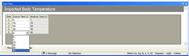 Click the imported load object and the Data View tab with updated Analysis Times is displayed. If the Analysis Time is different, the Source Time will display the original time, matching to the closest available Source Time coming from Icepak. If the match is not satisfactory, you can select a Source Time(s) from the drop-down list and Mechanical will calculate the source node and temperature values at that particular time. This combo box will display the union of source time and analysis time values. The values displayed in the combo box will always be between the upper and lower bound values of the source time. If you modify the source time value, the selection will be preserved until the user modifies the value even if the step's end time gets changed on the analysis settings object. If a new end time value is added/deleted, Source Time will get the value closest to the newly added Analysis time value.