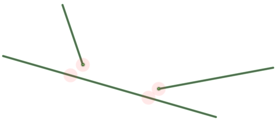 [接続] ツールは、近隣にあるビームに接続するために延長または移動できるエンドポイントとエンドポイントの接続を検出します。以下の画像は、3つ目のビームに接続するために延長できる2本のビームを示しています。[接続]ツールは、エンドポイントを検出してハイライト表示します。