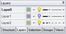 レイヤは、視覚的特徴に基づくグループ化メカニズムと考えることができます。視覚的特徴には、表示/非表示、色分け、線スタイルが含まれます。レイヤの管理は [レイヤ] パネルで行い、レイヤに対するアクセスおよび変更は [スタイル] グループにある [表示] タブのレイヤツールで行います。