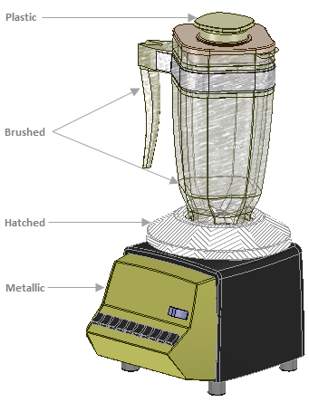 4 つのレンダリングスタイルを以下に示します。ピッチャーの上部はプラスチックに設定され、ハンドルとピッチャーはブラシ仕上げ、ブレードベースはハッチ仕上げ、ピッチャーのベースはメタリック仕上げです。
