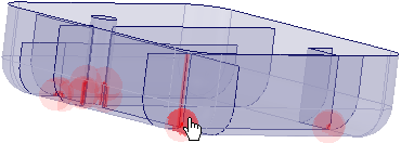 Gebruik de tool Uittrekken om oppervlakken uit te trekken of bij te snijden en samen te voegen met aangrenzende delen of om schetscurves uit te trekken of bij te snijden. De tool detecteert automatisch zijden die kunnen worden uitgetrokken of bijgesneden en markeert ze, zoals hieronder is weergegeven. Klik op een gemarkeerd gebied om de uittrekking of bijsnijding uit te voeren. U kunt ook een oppervlak selecteren die niet automatisch werd gedetecteerd en proberen om deze bij te snijden of uit te trekken. Deze tool werkt alleen met oppervlakdelen en schetscurves.