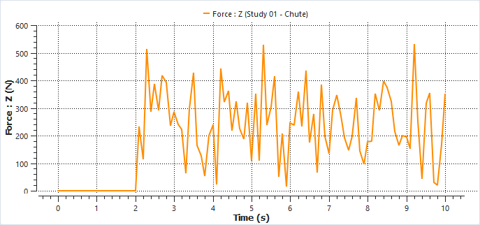 完成仿真处理后,您可以进行的一项分析是量化颗粒与传送槽碰撞时的力。通过绘制Force : Z,我们可以看到这个量随时间的变化情况。