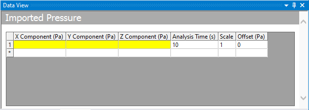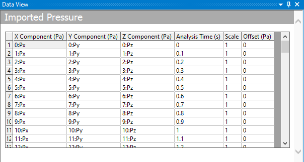 在Data View面板中,通过为每个记录的输出定义以下分量(X Component (Pa)、Y Component (Pa)和Z Component (Pa))来填写Imported Pressure表格,如下所述。