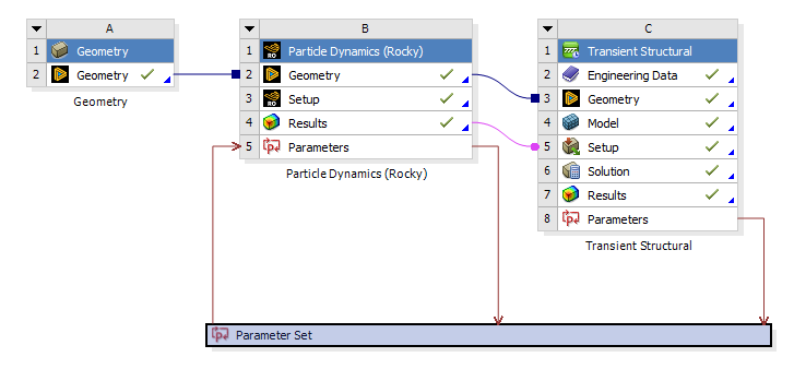 创建一个新的Ansys Workbench项目,将导入的几何结构连接到Rocky和Ansys Transient Structural - Mechanical。