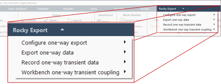 在Fluent程序窗口的顶部,查看是否列出了Rocky Export 菜单(如图所示)。