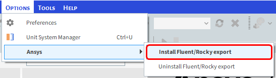 如果您在Fluent中没有看到该菜单,则执行以下操作:从Rocky 程序的Options菜单指向Ansys,然后点击Install Fluent/Rocky export (如图所示)。