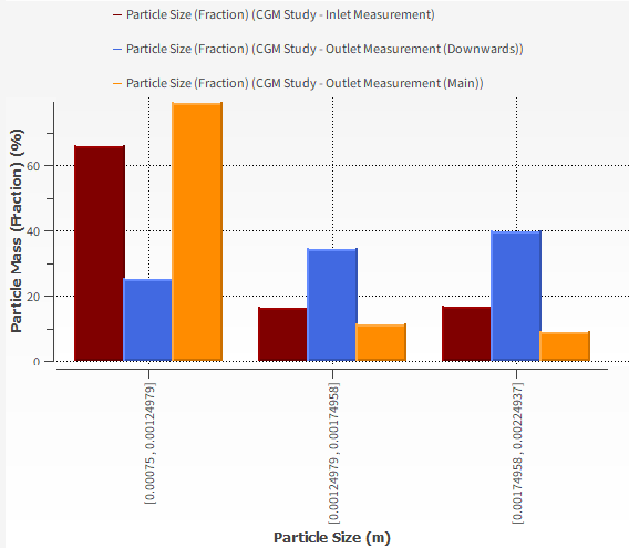暗红色Bin表明大约66%的Inlet 质量分数是小颗粒。中型和大型颗粒各占17%的质量分数。