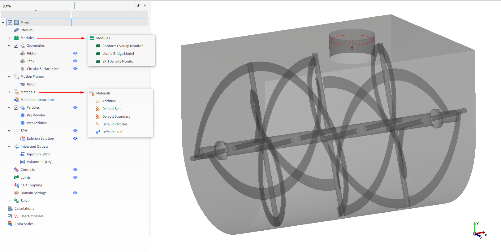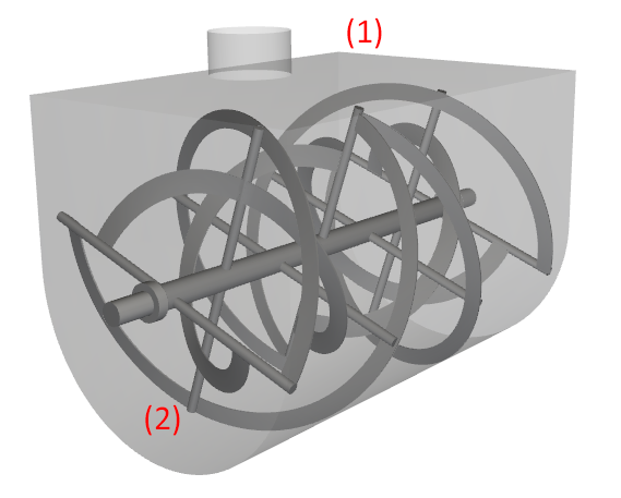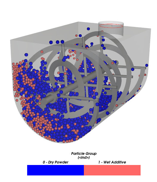本教程考虑的场景是评估带式搅拌机结合两种不同材料的混合性能:一种是粉末材料(干);一种是添加剂材料(湿)。