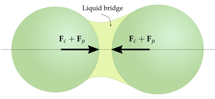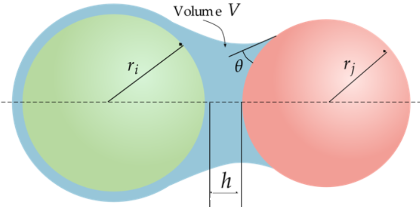 Liquid Bridge Model应用于颗粒的粘附模型,该模型主要仿真当湿颗粒足够接近另一个颗粒或液膜接触或“桥接”的边界时所出现的情况。