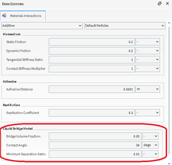 Material Name Additive Use Bulk Density (已启用) Bulk Density 640 [kg/m3] Young's Modulus 1e+07 [N/m2] L Materials Interactions … | Default Particles ⯆ Default Particles ⯆