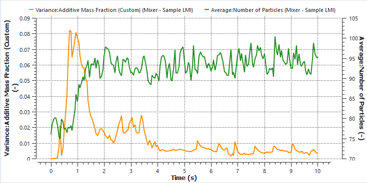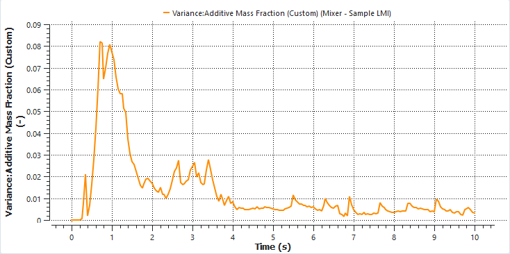 在Sample LMI实体的Properties选项卡上,右键单击Additive Mass Fraction (Custom),指向Time Plot,指向Show in new Time Plot,然后单击Variance。(结果如图所示。)