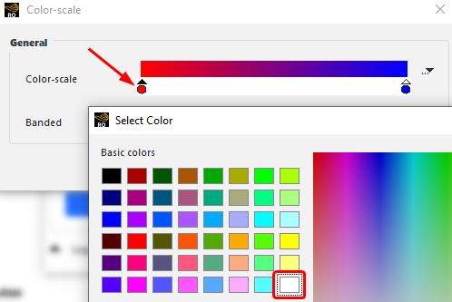 在红色到蓝色的Color-scale下面,双击红色圆点,然后在Select Color 对话框中,选择白色(如图所示),然后单击OK。