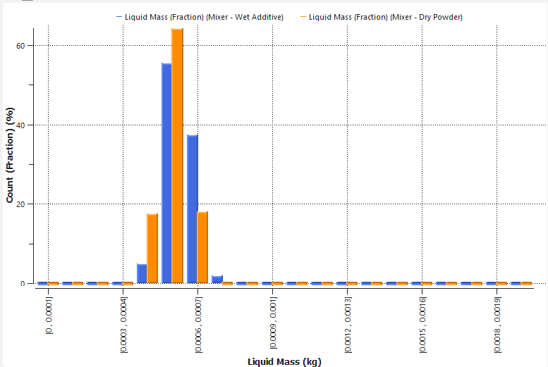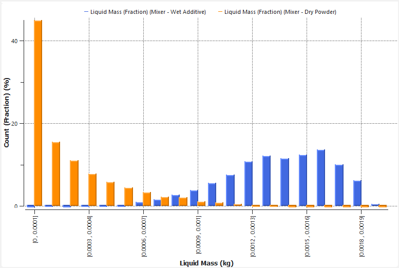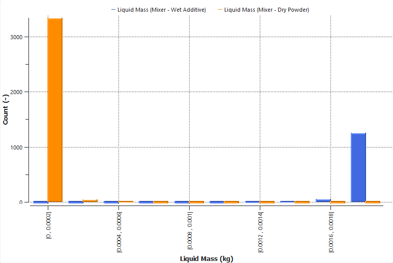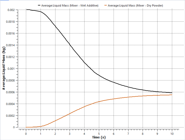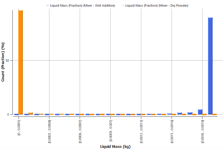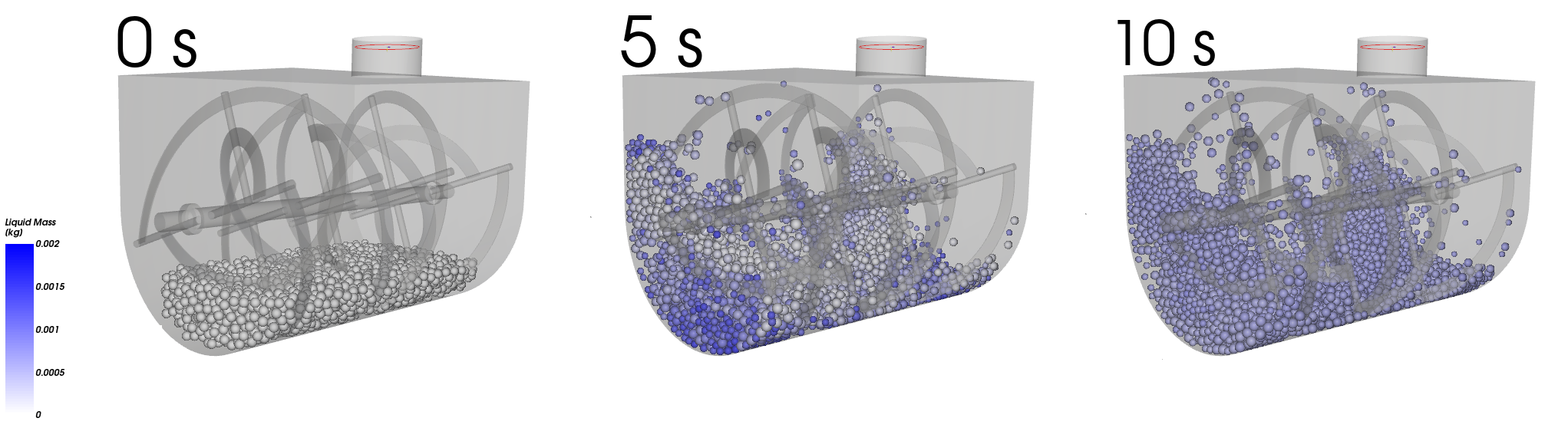 由此得到的时间图 显示,在仿真结束时,最初只在湿颗粒中的液体经过混合,均匀分布在湿颗粒和干颗粒中。