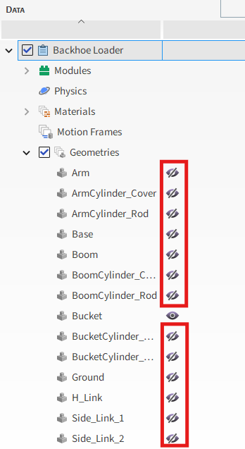 在Data面板的Geometries下,多选除Bucket组件以外的所有组件,然后点击眼睛图标,在视图中隐藏除铲斗之外的所有组件(如图所示)。