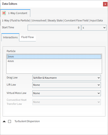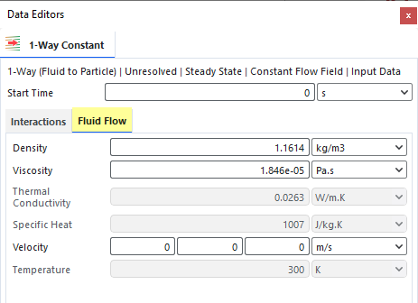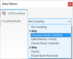 在Data Editors面板中,从Coupling Mode列表的1-Way下选择Constant (Fluid > Particle)(如图所示)。