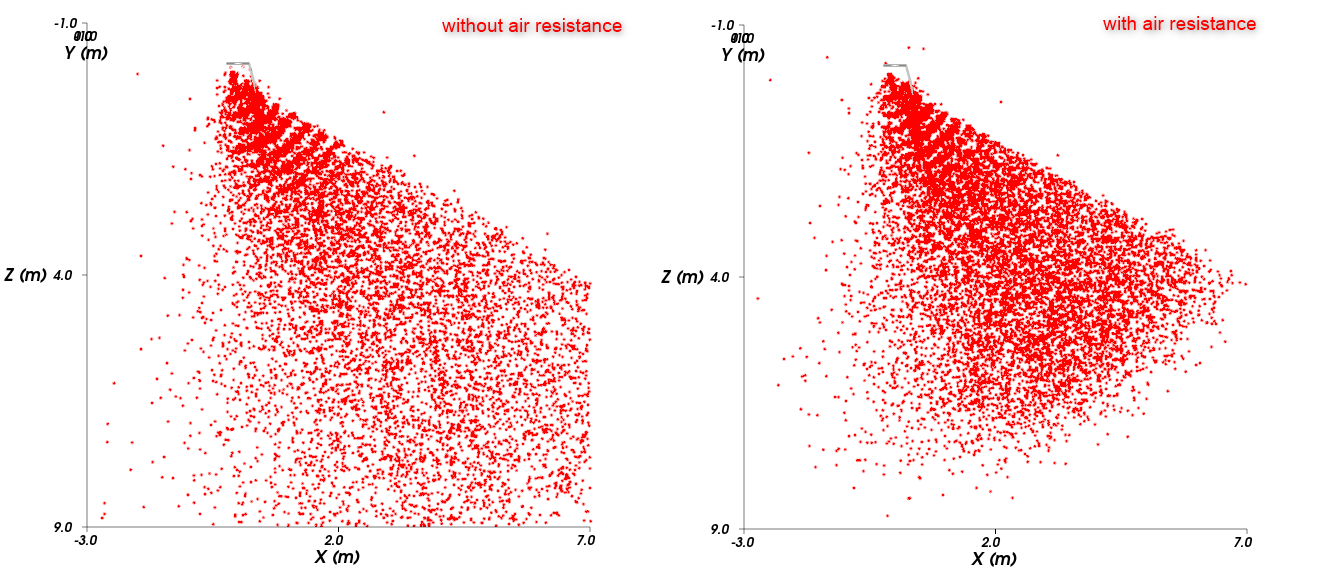 不考虑空气阻力的仿真,其颗粒撒播的距离比在项目中考虑了空气阻力时远得多。