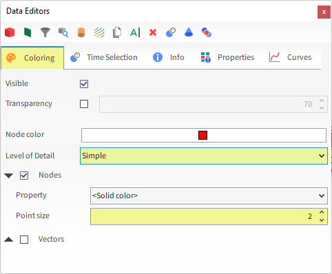 Cube Center 2, -0.95, 4 [m] Magnitude 20, 0.1, 20 [m] Coloring Level of Detail Simple ⯆ Nodes | Point Size 2 [ - ] 在Data面板中,从视图中隐藏Particles Time Selection <01> 。
