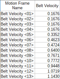 Frame Name Belt Velocity <01> Keep in Place Global ⯆ Add motion Velocity 0.1676, 0, 0 [m/s] C Geometries ﹂Belt_01