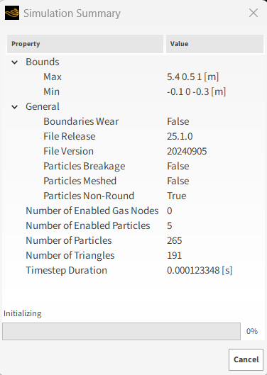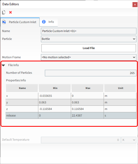 在File Info下,我们可以验证汇总的信息,例如Number of Particles以及在我们加载的.csv文件中定义的各种Properties的Min值和Max 值。