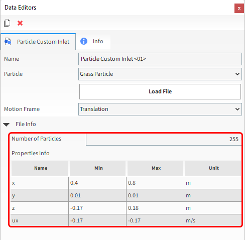 重要: 当您将Motion Frame附加到Particle Custom Inlet时,.csv文件中的release属性必须为所有颗粒设置为零或全部省略。