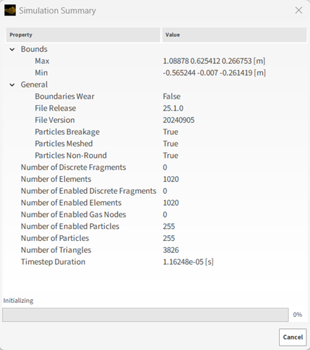 步骤 数据实体 编辑器位置 参数或操作 设置 A Solver Solver | Time Simulation Duration 3 [s] Output Settings | Time Interval 0.005 [s] Breakage | Start 0 [s] Breakage | Delay After Release 0 [s] Solver | General Simulation Target CPU ⯆