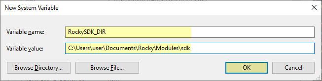 在New System Variable对话框中,将Variable name定义为RockySDK_DIR ,并使用the SDK subdirectory的文件夹路径定义Variable value(如图所示),然后点击OK。