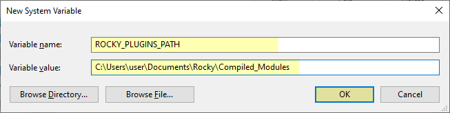 按照第 23.1.4.2 节 “SDK变量创建(WINDOWS)”上的指令创建一个新的 ROCKY_PLUGINS_PATH环境变量,该变量指向将在其中创建编译模块文件的文件夹位置。(在本教程中,它是%HOMEPATH%/Documents/Rocky/Compiled_Modules 文件夹。)