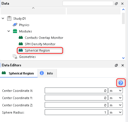 启用新的Spherical Region 模块(在第 23.2.11.1 节 “打开Rocky”上有详细说明),然后定义参数(如图所示)。
