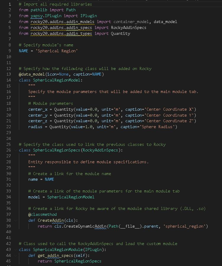 【第12-22行】定义辅助类SphericalRegionModel,其中包括模块参数的定义。Rocky Solver SDK为此提供了一个名为Quantity的特殊类型,其中包括将单元关联至每个变量的功能。