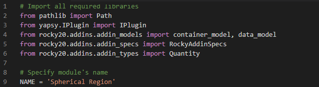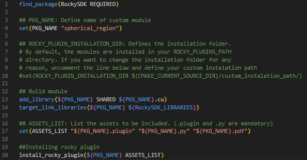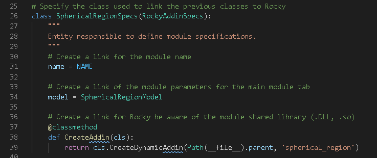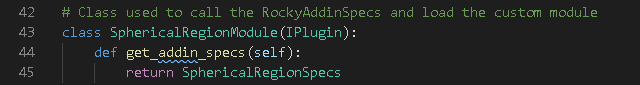 【第43行】包括SphericalRegionModule类型,其将模块定义为一个新的Rocky插件,并将模块规范与Rocky挂钩。