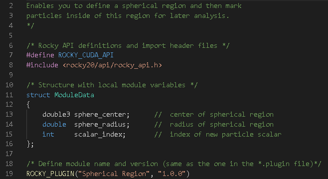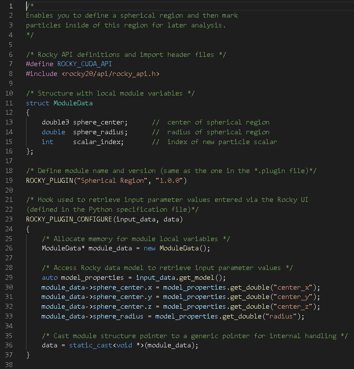 模块的CUDA file (spherical_region.cu)包括在仿真期间执行模块预期功能的所有C++代码。