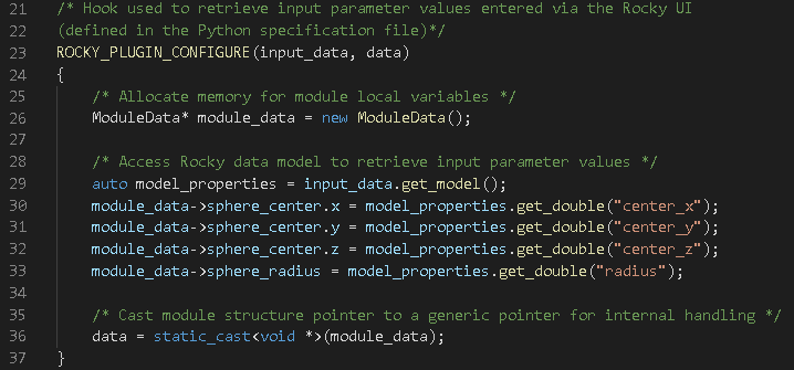 【第36行】该指针会转换为一个void指针,以便将其分配给函数参数数据,Rocky将存储这些数据并在仿真的后续阶段提供。