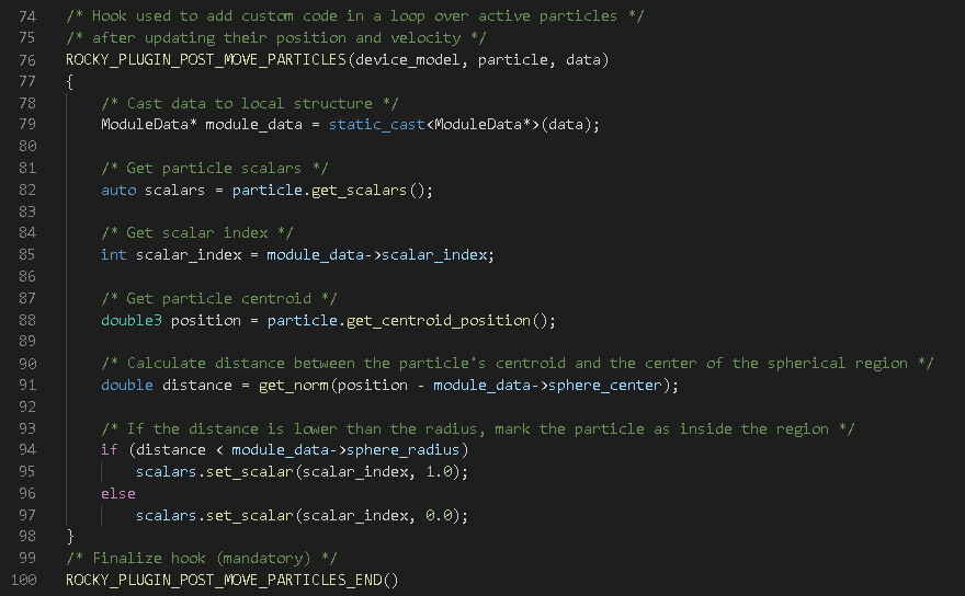 【第76-98行】ROCKY_PLUGIN _POST_MOVE_PARTICLES():在Rocky中更新了颗粒的位置和速度之后,挂钩通过仿真中的活动颗粒在循环(时间迭代)中执行。