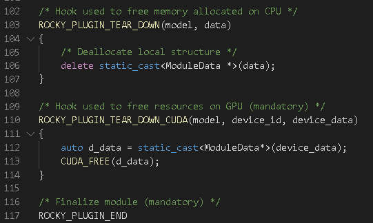 【第110-114行】ROCKY_PLUGIN_TEAR_DOWN_CUDA():在这个挂钩中,模块必须在执行ROCKY_PLUGIN_INITIALIZE_CUDA()期间释放为GPU器件中的自定义数据分配的内存。