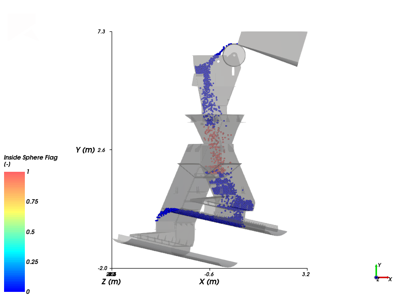 仿真完成后,您就能通过在3D View 窗口上查看Inside Sphere Flag 属性来可视化处于所定义区内的颗粒。