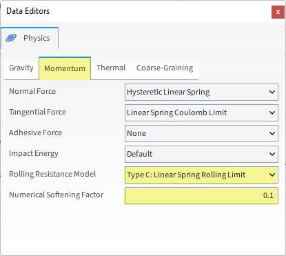 从Data Editors面板中,选择Momentum子选项卡,然后设置Rolling Resistance Model和Numerical Softening Factor。