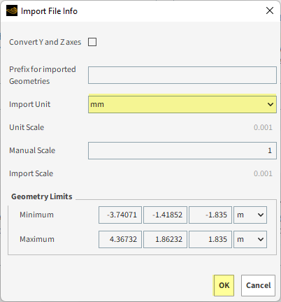 从Import File Info对话框中,选择“mm”作为Import Unit,确保Convert Y and Z axes选项被清除,然后单击OK。