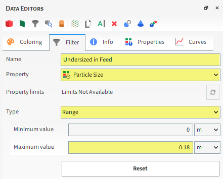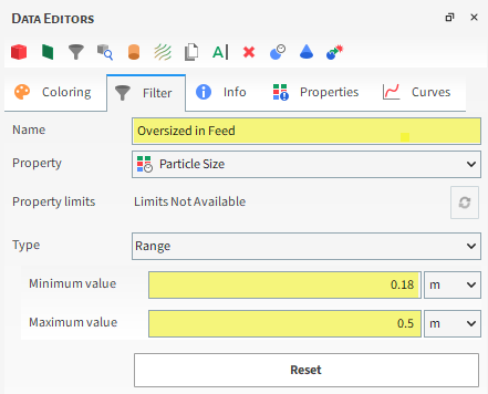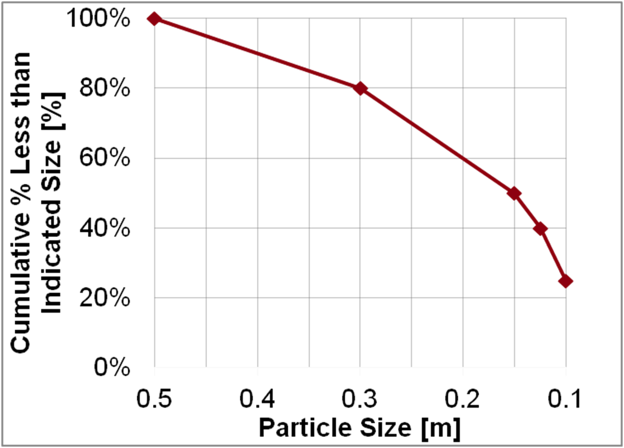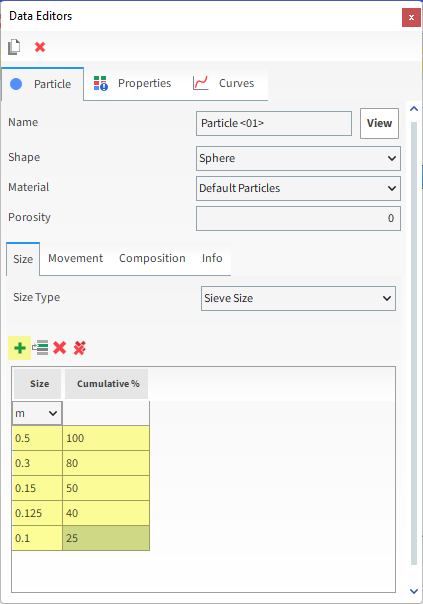根据筛分分析,Rocky使用小于指定尺寸的颗粒的离散Size范围和Cumulative %质量。