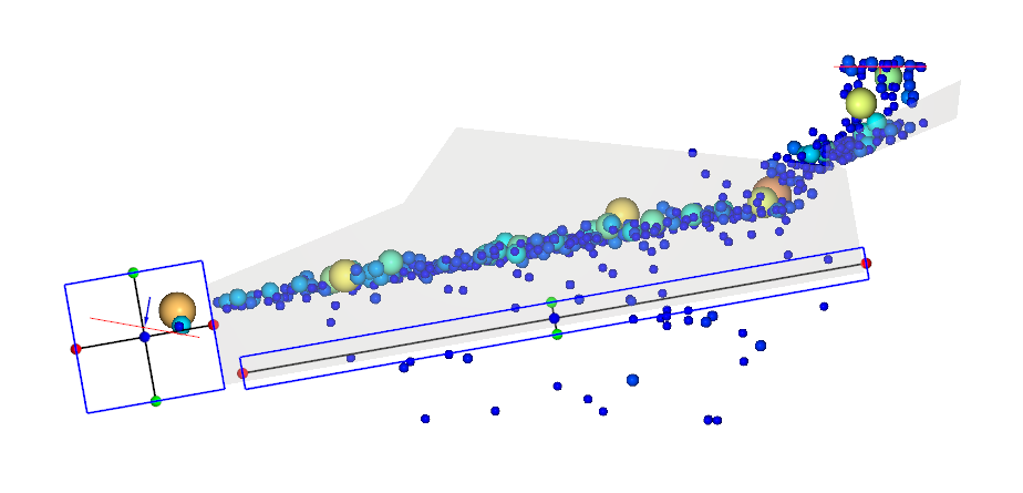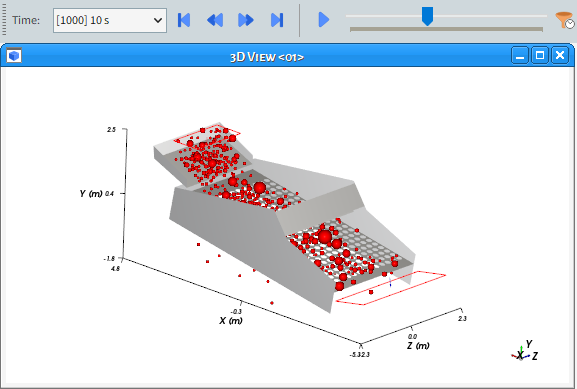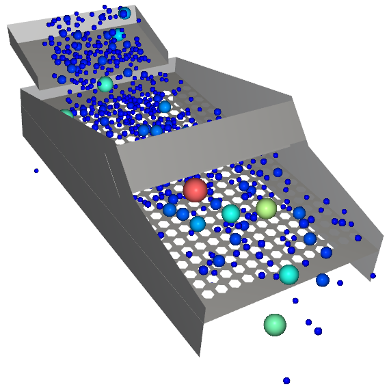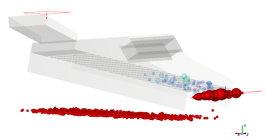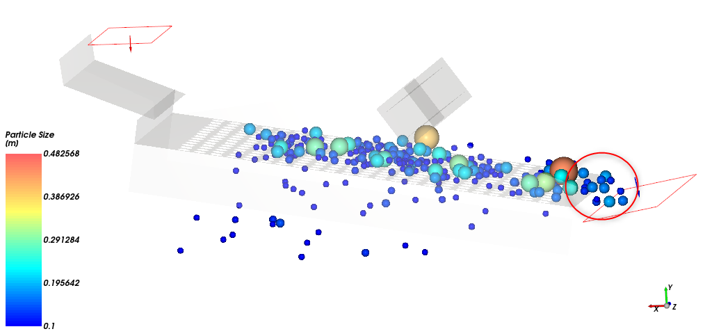 在这个案例中,EU = 0.690725,这意味着并非所有Undersized颗粒都能通过筛网。查看3D视图,我们可以看到许多较小的颗粒与较大的颗粒一起从溢出区域中流出。