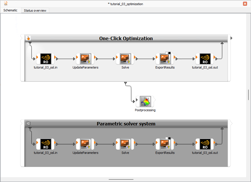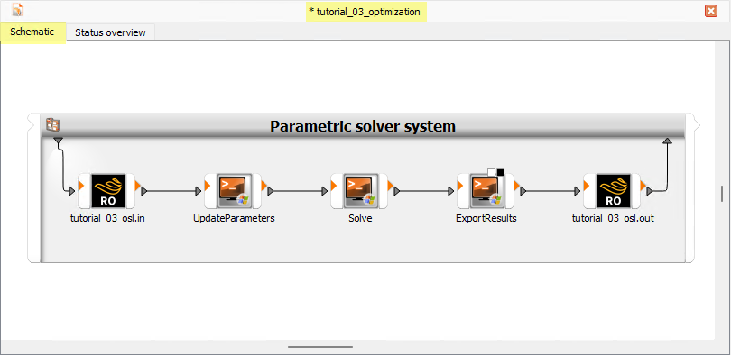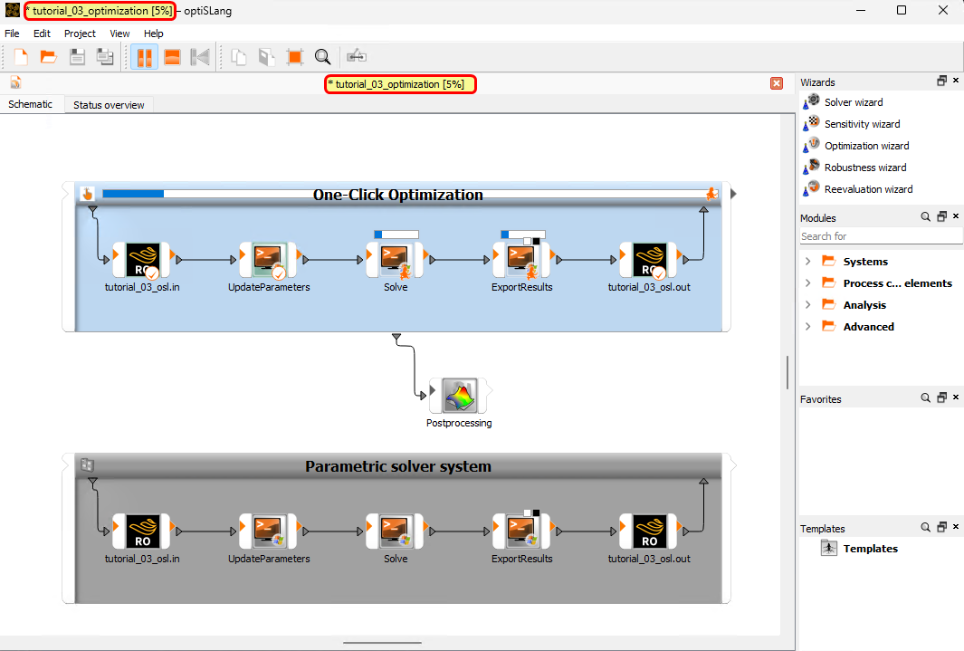 ,并从Save Project对话框中,选择您的项目目录,将File name定义为tutorial_03_optimization,然后单击Save。optiSLang中的项目Schematic现在应该看起来像这样: