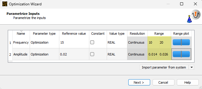Optimization Wizard对话框显示了Parametrize Inputs。