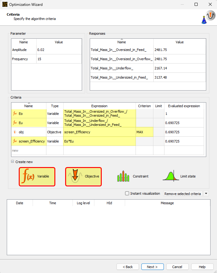 为目标定义Expression和Criterion,以最大限度提高振动筛效率。