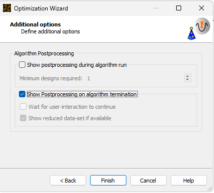 在Additional options上,您可以选择在优化处理期间或完成后可视化后处理。对于本教程的目的而言,我们只需要在结束时对其可视化,因此您可以保留默认设置,然后单击Finish。