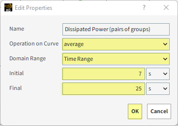 为了比较两种不同方法的耗散功率,我们将使用从7秒(Energy Spectra Start)到25秒(Simulation Duration)的平均值,而不是使用特定时间作为Dissipated Power (pairs of groups)输出变量中的Operation on Curve的值。