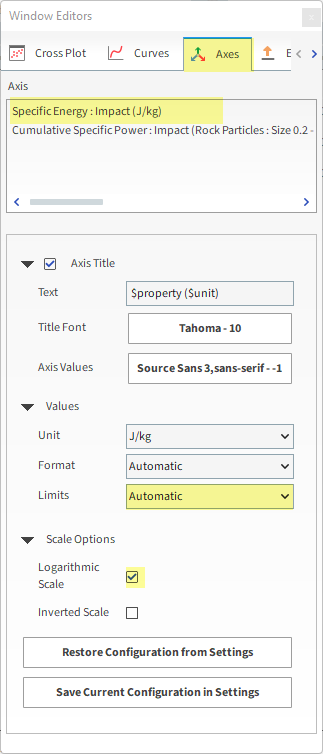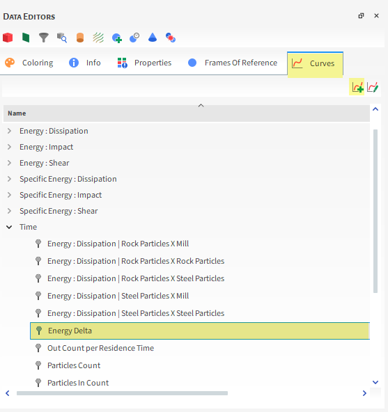 在Data Editors的Curves选项卡中,在Energy : Impact下方,您可以重复相同的步骤,以创建新的交叉图,显示了(仅)岩石颗粒和磨机之间的碰撞的Power: Impact和Cumulative Power : Impact。(显示了结果图。)
