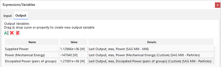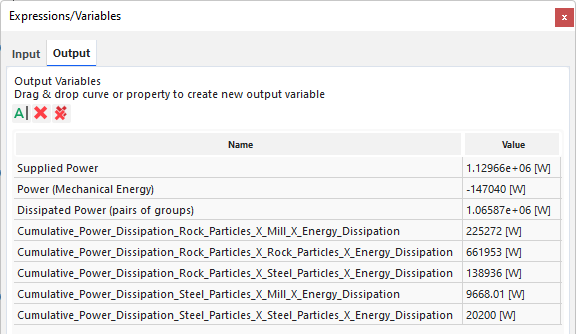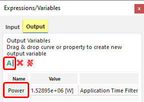 从Data Editors面板的custom下方,将新创建的Dissipated Power (pairs of groups) (Custom)拖放到Expressions/Variables面板的Output选项卡上。