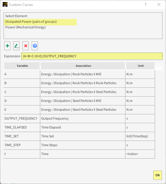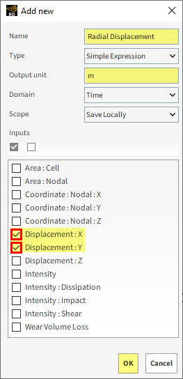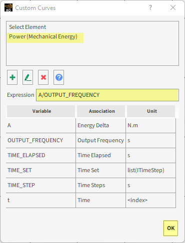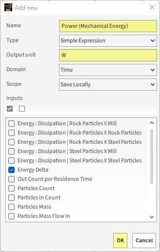在Add new对话框中,定义Name和Output Unit,然后在Inputs下方,启用所有Energy : Dissipation成对曲线(如图所示),然后单击OK。