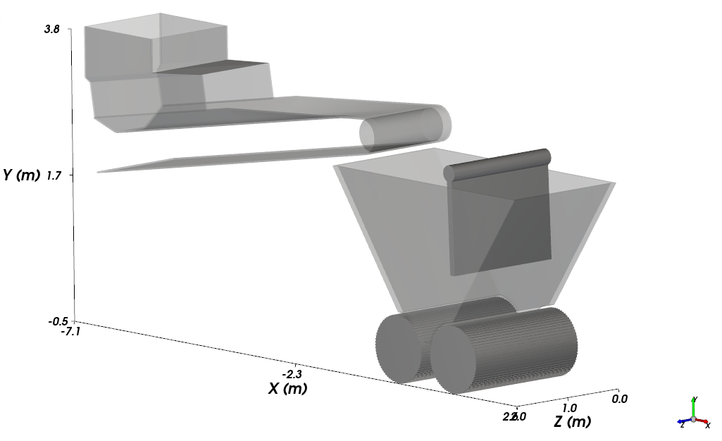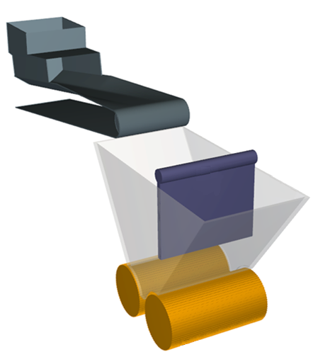 Geometry Belt Width 1.5 [m] Orientation Belt Incline Angle 10 [dega] Vertical Offset 3 [m] Horizontal Offset -1 [m] Out-of-Plane Offset 1 [m] Feeder Box Front Plane Offset 1 [m] B Geometries Import Wall Deflector.stl、Hopper.stl、Roll 1.stl的Import Unit为“mm”
